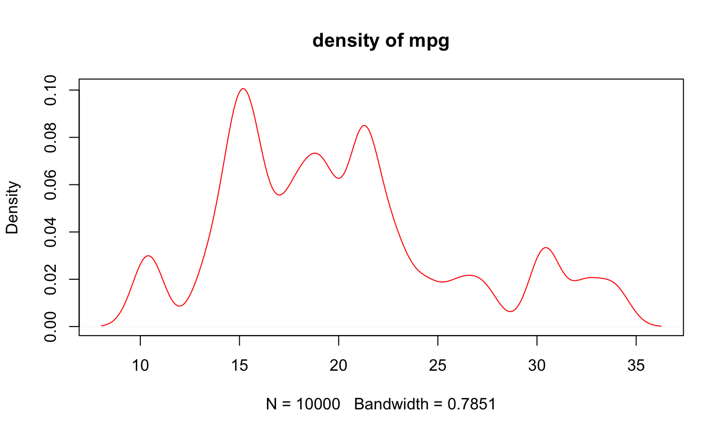# 指令壓縮 plot(density(sample(mtcars$mpg, size=10000, replace=TRUE), kernel="gaussian"), col="red", main="density of mpg")