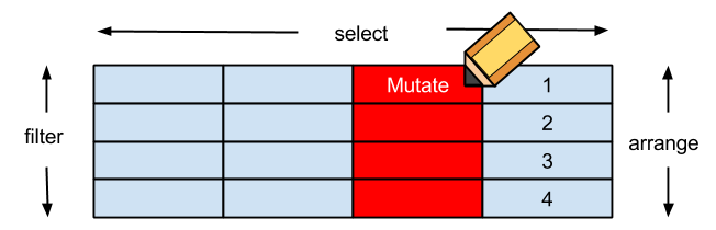 arrange 排列filter 對列做篩選 (row)select 對欄做篩選 (column)mutate 更改欄或新增欄group_by + summarise 分類